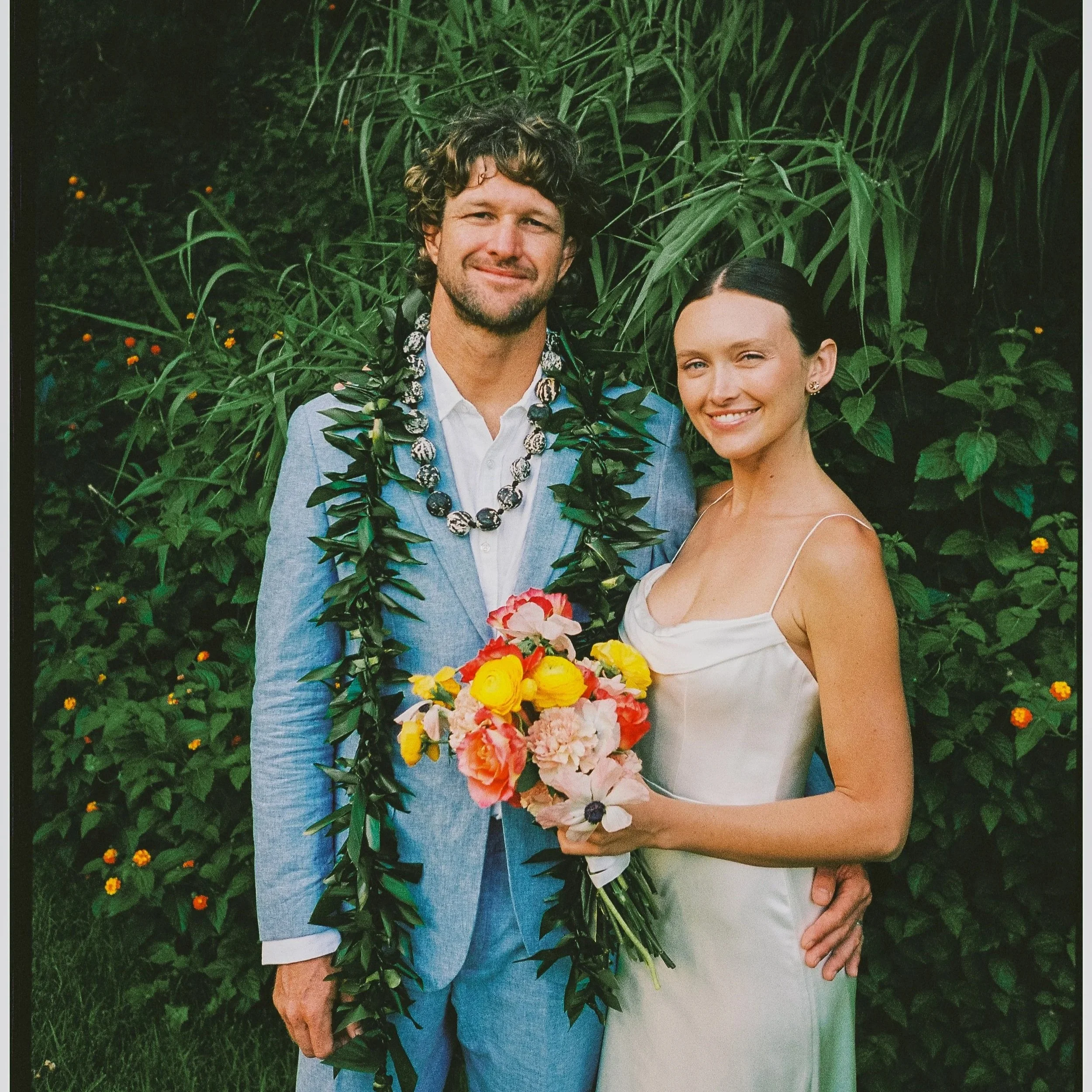 They exchanged vows barefoot, with the soft light filtering through and a quiet stillness in the air. One of the most meaningful elements was the presence of the lei, a traditional Hawaiian symbol of love, respect, and connection. Worn by both of them, it added a subtle but powerful layer of identity to the celebration.